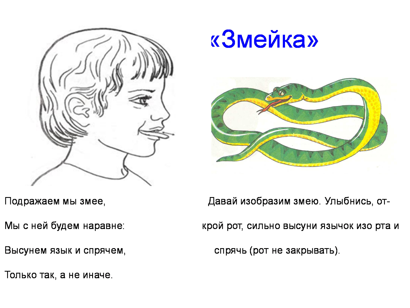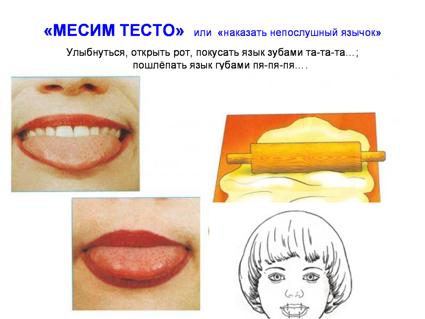 В 4—5 лет занятия проводятся с целью закрепления старых понятий и введения новых, например, верхние и нижние зубки, узкий и широкий язычок, бугорки за зубками. Рекомендуемые упражнения: