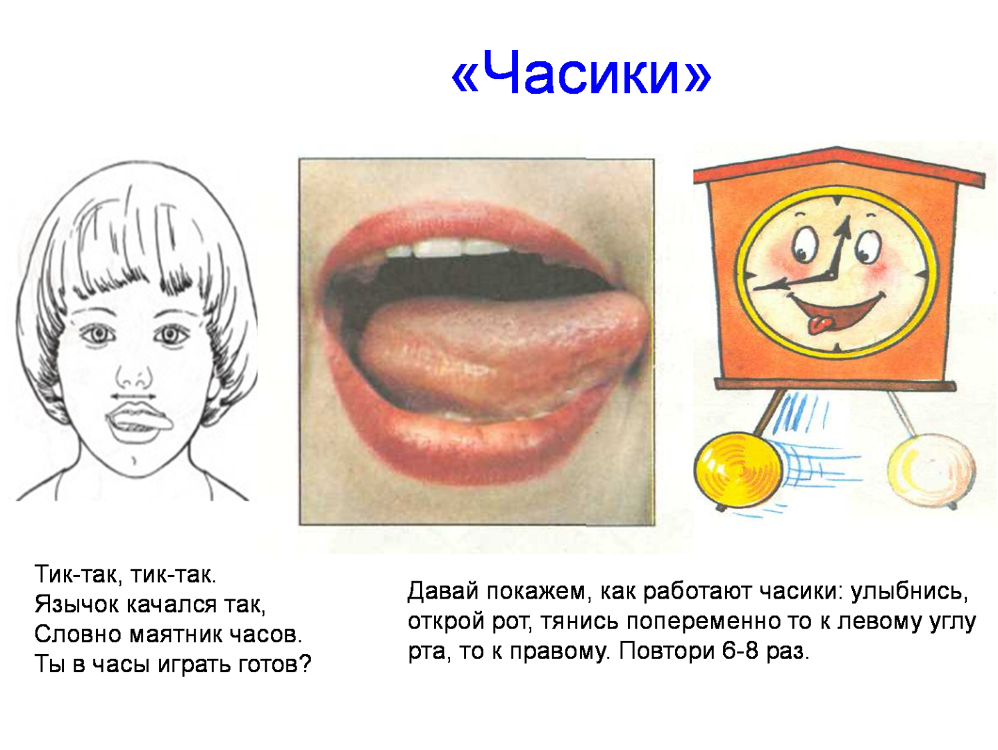 - «Почистим зубки» — ротик широко открыт, губки сложены в улыбку, двигая язычком влево-вправо, малыш как бы чистит зубки изнутри (остальные органы остаются неподвижными, работает исключительно язык);
