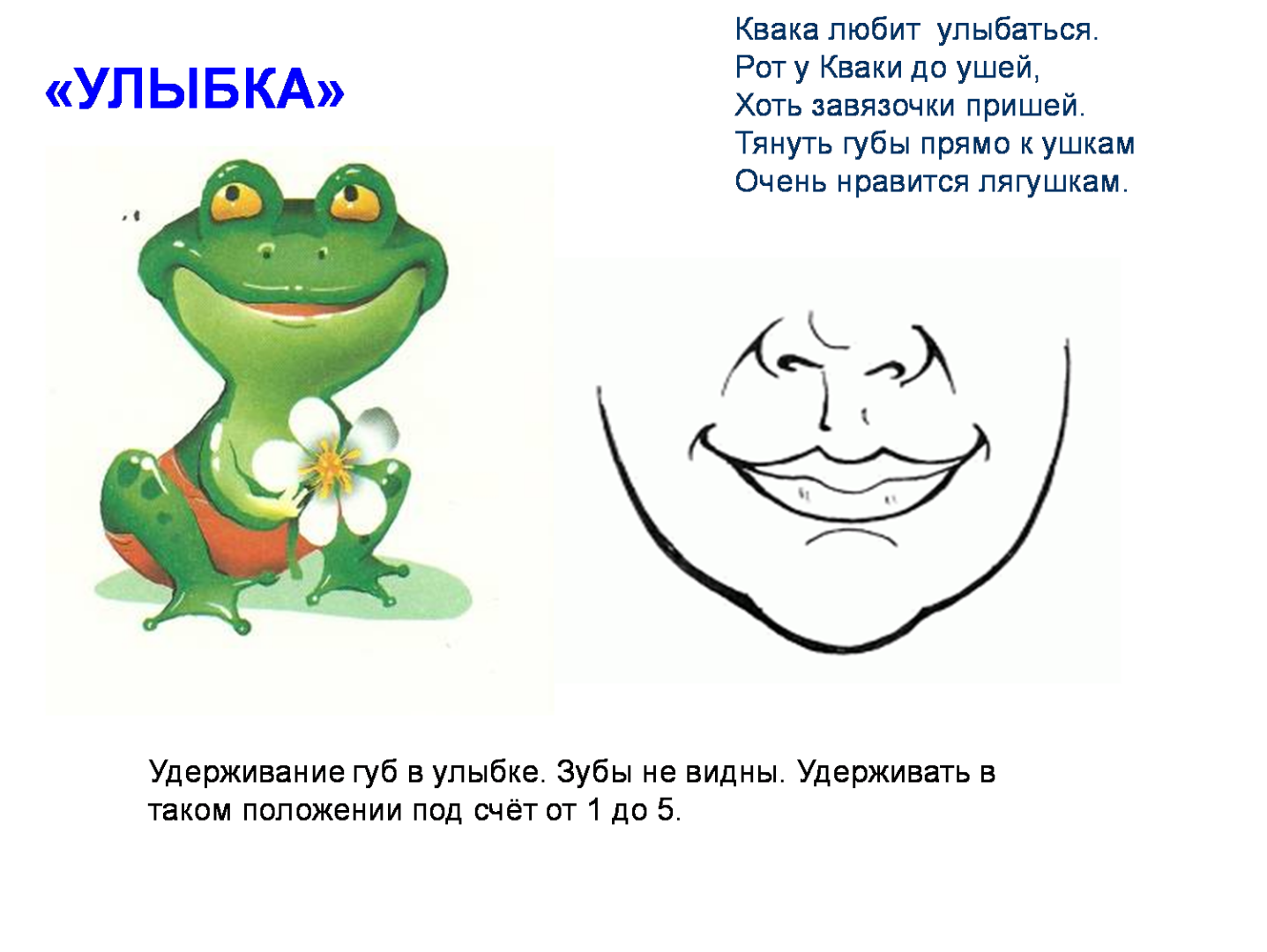 «Улыбка». Надо растянуть губы в улыбке и удерживать