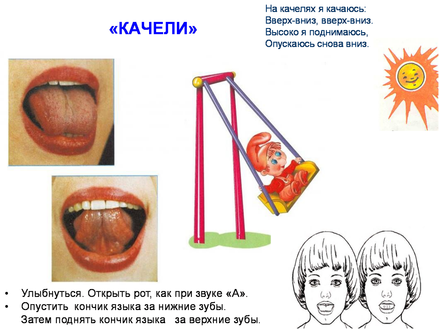 поднимаем ее за верхние зубы. Затем предлагаем ребенку опустить язычок, закрыть рот, расслабиться, сглотнуть слюну.