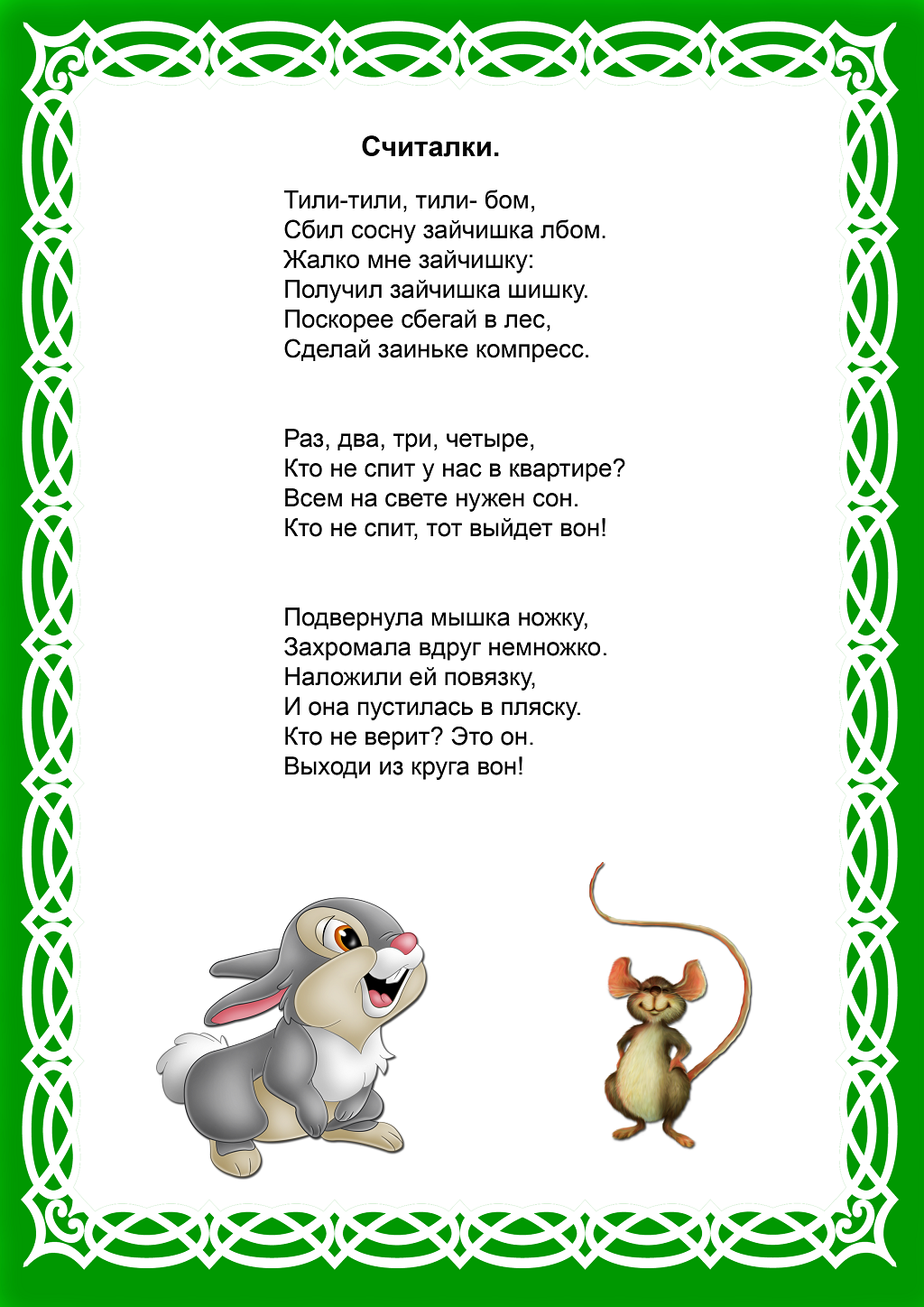 Подбор детских считалок для дошкольного возраста осуществляется каждым родителем, воспитателем по его личному усмотрению, исходя из того, что известно о конкретном ребенке.
