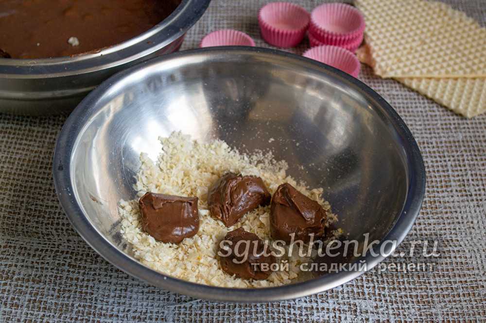 Из трюфельной массы сформовать небольшие шарики. Треть шариков обвалять в вафельной смеси, треть — в порошке какао, треть — в ореховой крошке. Поместить конфеты в холодильник еще на 1 ч.