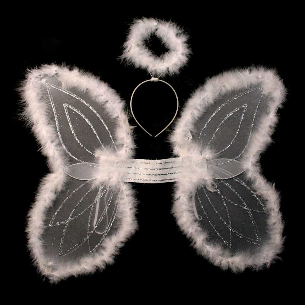 Крылья – неизменный атрибут костюма ангела, используемого для детских утренников, школьных спектаклей, новогодних маскарадов, а также фотосессий. Изготовить их можно самостоятельно, сделав проволочный каркас и обтянув его белой тканью или вырезав шаблон из картона и обклеив его бумагой.