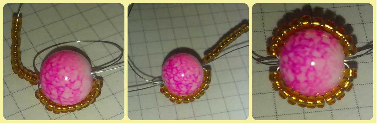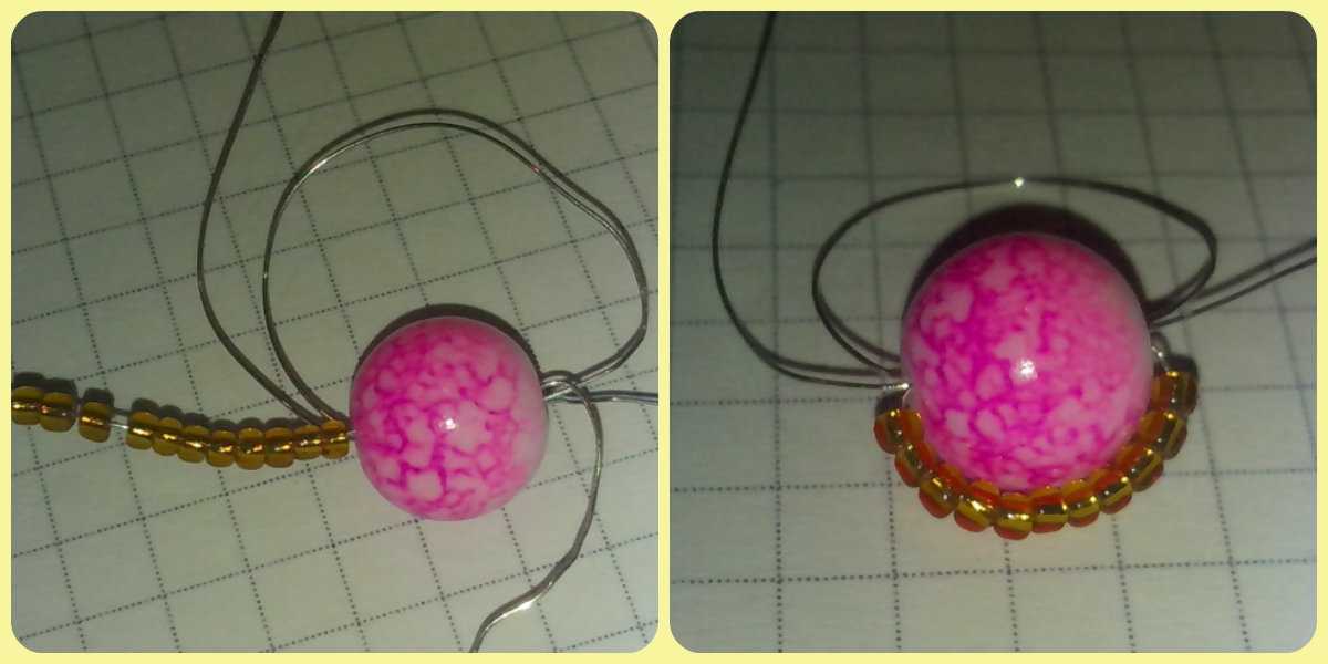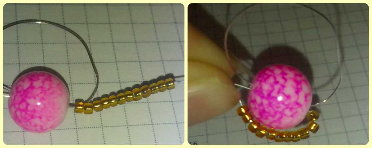 4. Такое же количество бисеринок надеваем на левую проволоку и повторяем предыдущий шаг зеркально так, чтобы нанизанный бисер располагался снизу и сверху бусины.