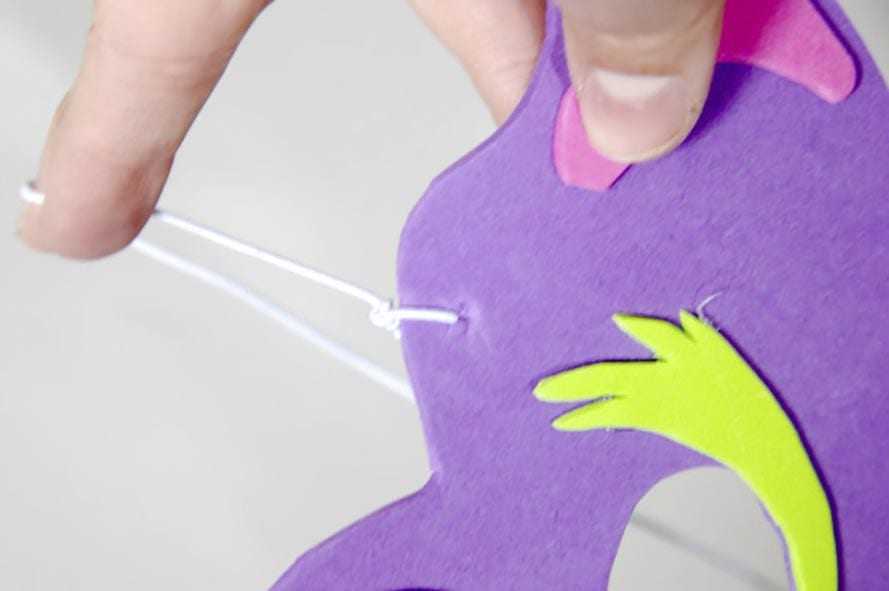 Ещё лучше будет, если верёвочка крепится первым способом (через дырочки и завязочки), но места отверстий плотно заклеиваются скотчем или клеем. Таким образом места крепления будут твёрдыми и крепкими, не порвутся от случайного движения.