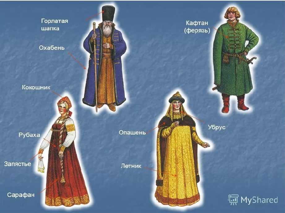 Обязательно нужно было быть подпоясанным кушаком (кожаным или тканевым). В зимнее время сверху знатные мужчины надевали охабень (вещь с длинными декоративными рукавами, которые завязывали на спине) и ферязь. Последняя представляла собой национальную одежду, которая застегивалась на груди накладными петлями, отличалась наличием длинных рукавов: правый надевался в сборку на руку, а левый свободно свисал. Русским женщинам по праздникам полагалось надевать два наряда – женский и девичий. Между собой они отличались наличием дополнительных атрибутов.