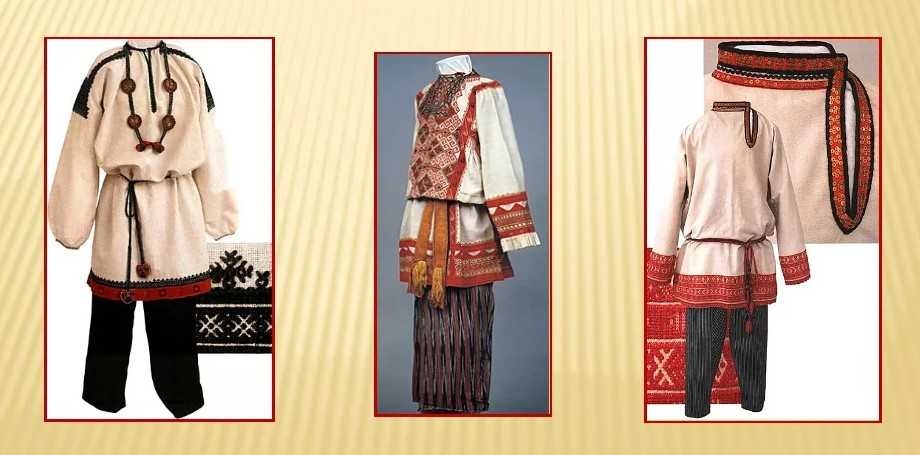 Все мужчины, начиная с мальчиков, носили рубахи, в основном это были рубахи-косоворотки. Считается, что вначале застёжка рубахи была по центру, косоворотка появилась, чтобы во время работы не выпадал нательный крестик. Горловина, рукава и низ украшали вышитыми мотивами, вышивку на рубахе, в которой женились, должна была сделать невеста. В этом обычае есть сакральный смысл, такая вышивка, сделанная руками любящей женщины, служила оберегом.