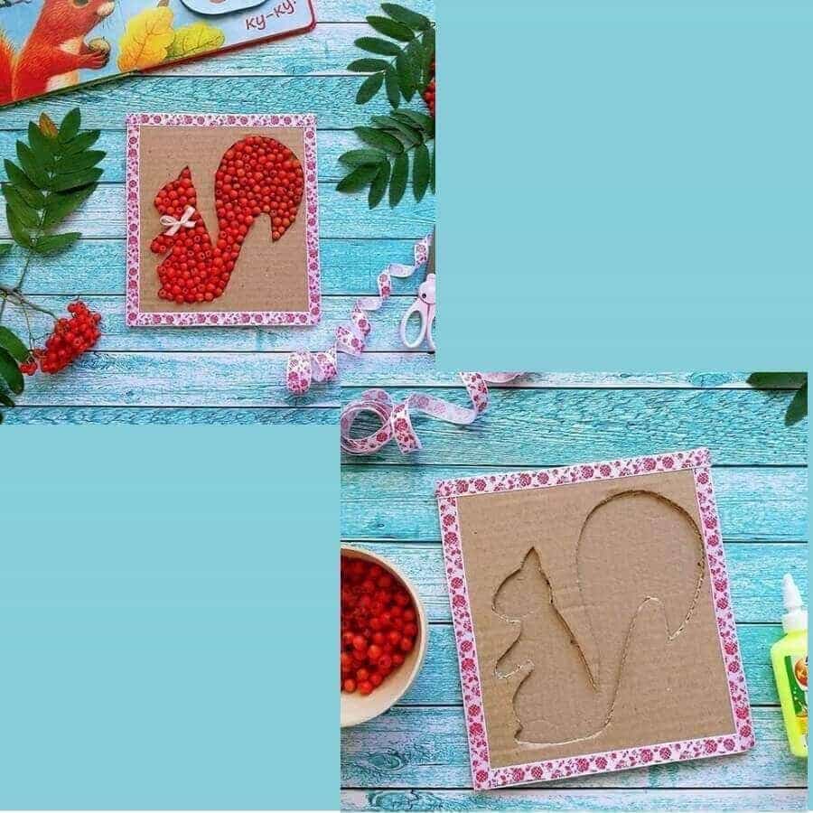 Для крупных композиций подойдут вырезанные и слегка тонированные листья из бумаги и картона. Крупные бусины или ягоды из окрашенных желудей могут стать ветками рябины. Более стильный вариант — композиции в технике квиллинга — кружевные орнаменты из цветных полосок.