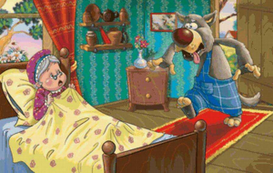 Подкрался он к окошку, заглянул внутрь – а там в кровати волк лежит.