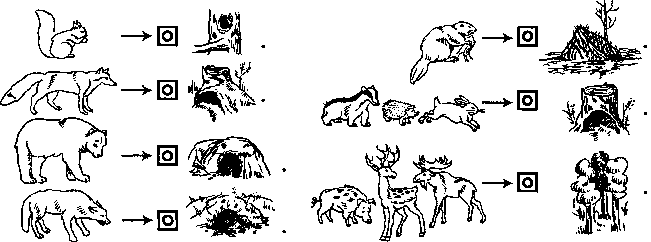 Лось . (чаща). Белка . (дупло). Бобр . (хатка) И т.д.