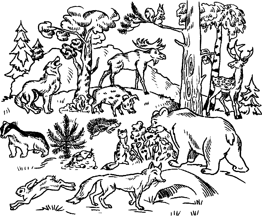 — Покажи и назови хищников. — Медведь, лиса, рысь, волк, барсук, ёж.