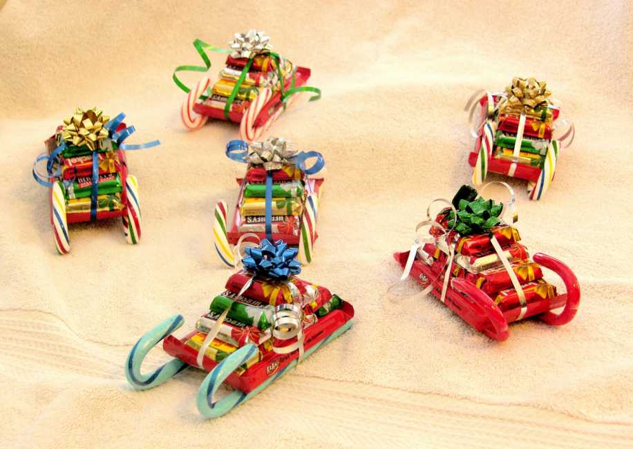 Можно дополнительно украсить сани ленточками и колокольчиками, чтобы они выглядели празднично. Единственный их минус — их быстро съедят и на память останутся только фотографии.