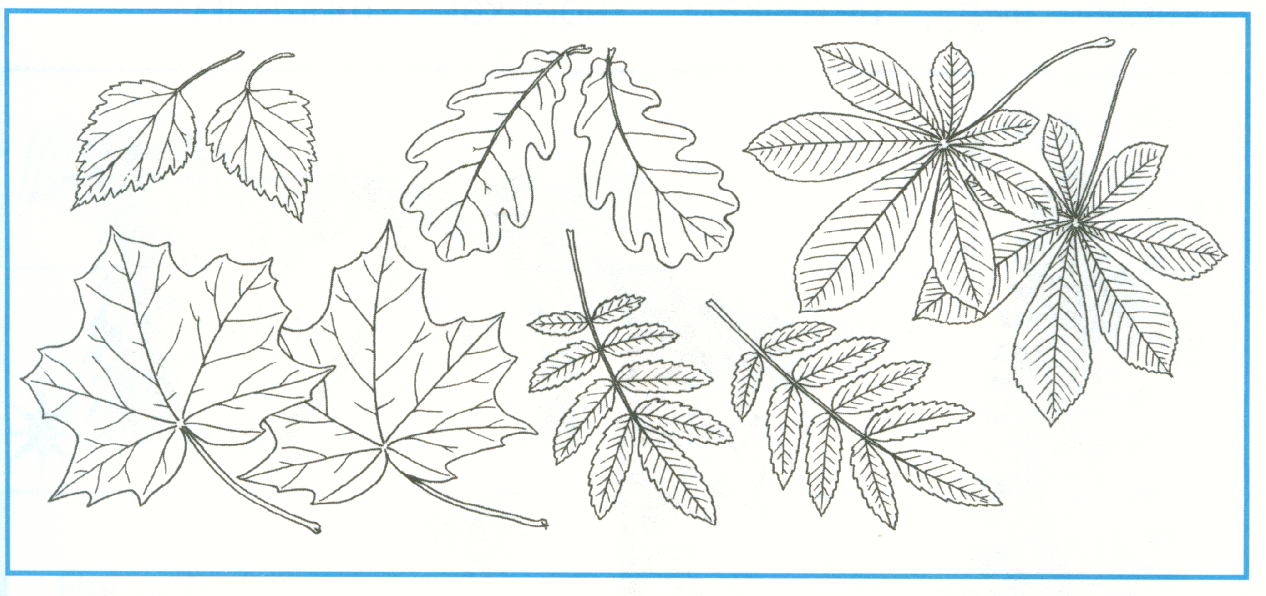 1. Назови, листья каких растений нарисованы. Раскрась листья так, чтобы в каждой паре слева был лист летней раскраски, а справа-осенней.