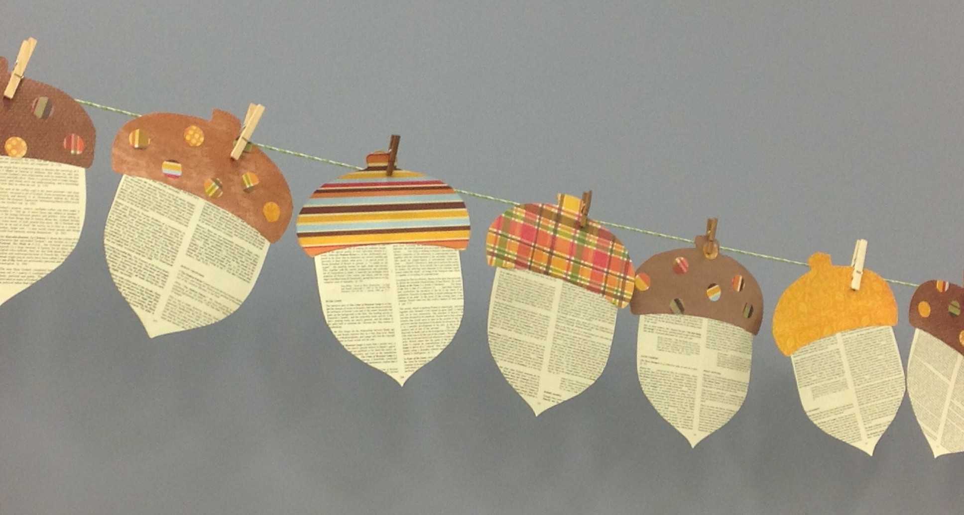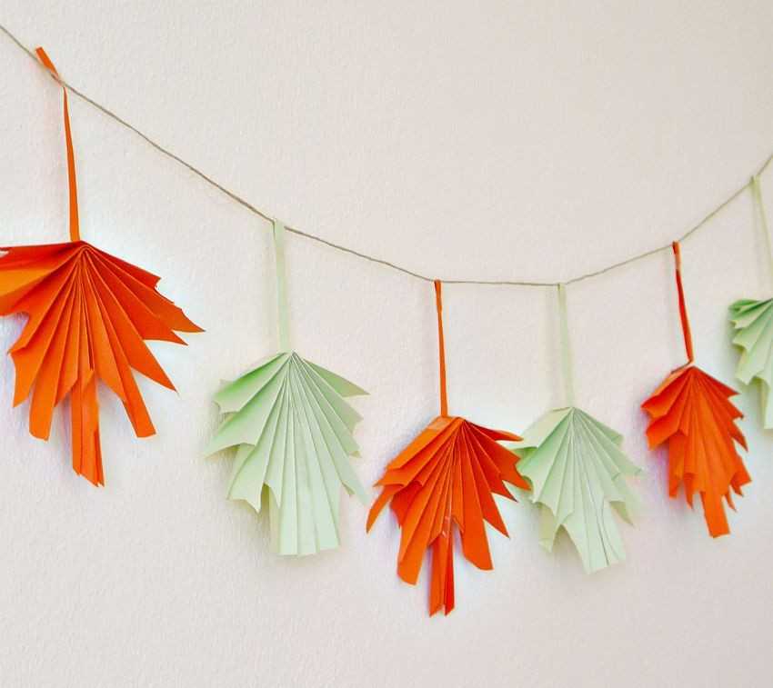 Самый простой, но в тоже время самый универсальный вариант, чтобы украсить детский сад к празднику осени, Новому году или к любому другому мероприятию. Такие гирлянды смогут сделать даже дети своими руками, вырезав листочки из разноцветного картона или цветной бумаги.