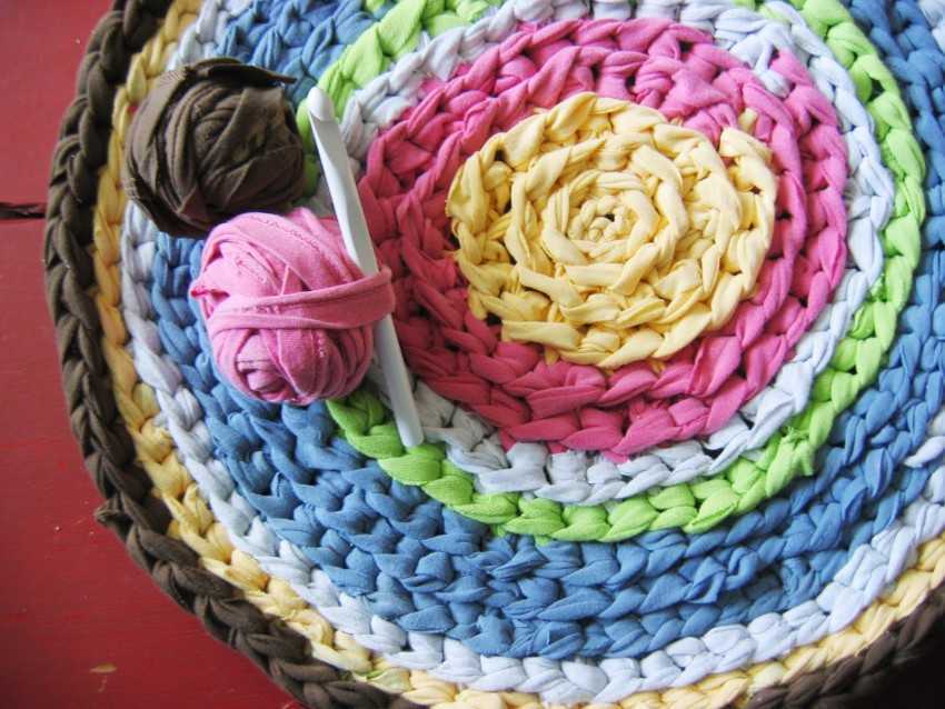 - из трикотажных футболок, отслуживших свое, получится оригинальный коврик для дома: