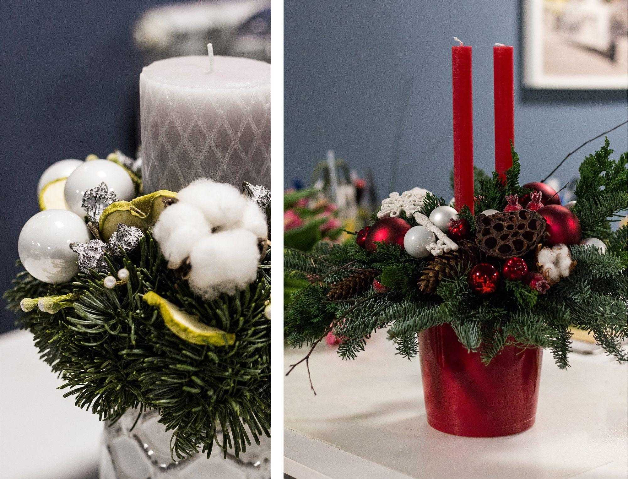 Также пиафлор и флористическая губка будут удерживать влагу, и букеты будут надолго сохранять свою свежесть. Еловые ветки податливые, и гибкие. Поэтому они могут принимать любую форму. После их нужно зафиксировать проволокой. Дополнительный декор нужно крепить с помощью суперклея. Сформировав букет добавьте к нему маленькие подсвечники-фонарики и у вас получится потрясающая композиция.