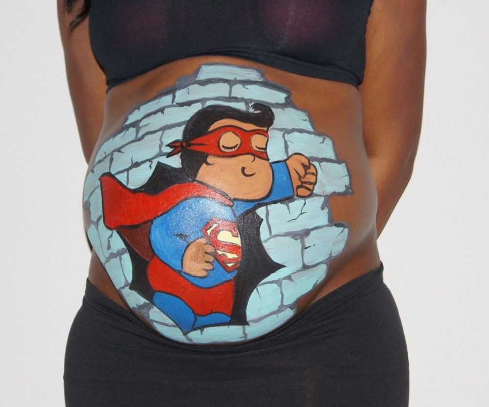 Если пол ребенка уже известен, можно обыграть этот факт. В ожидании мальчика можно украсить свой животик сочными зелеными, яркими синими и фиолетовыми красками, а также сделать акцент на «мальчишеских» сюжетах, среди которых: