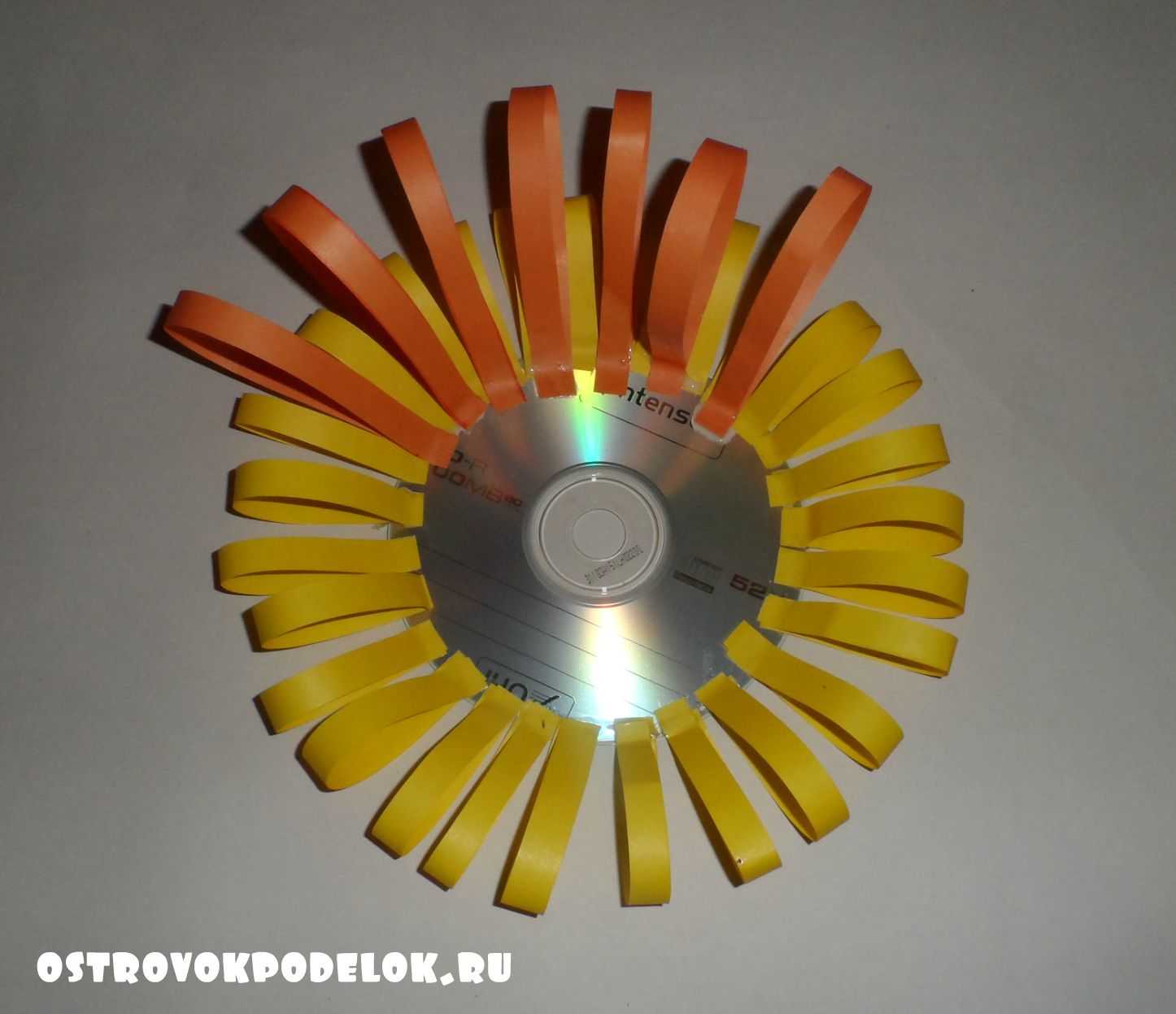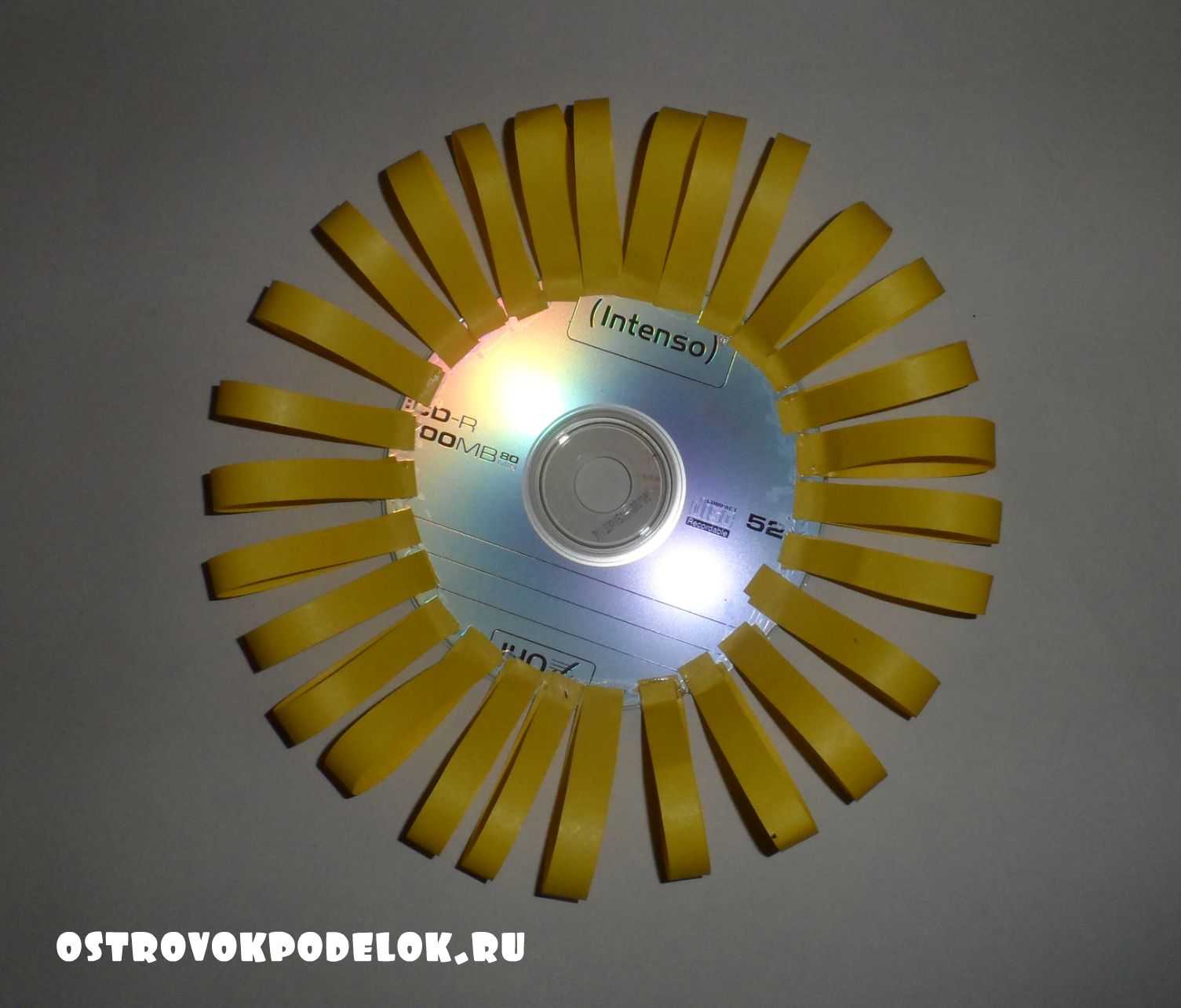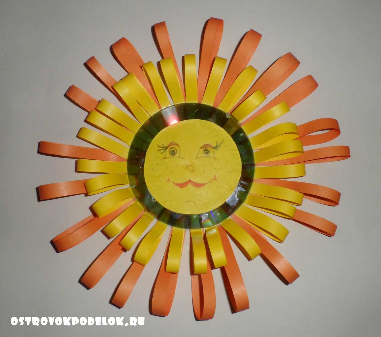 Вырезаем из желтого цвета бумаги кружок и рисуем личико солнышка. Приклеиваем личико к диску с другой стороны и перед нами оригинальное и яркое солнышко.