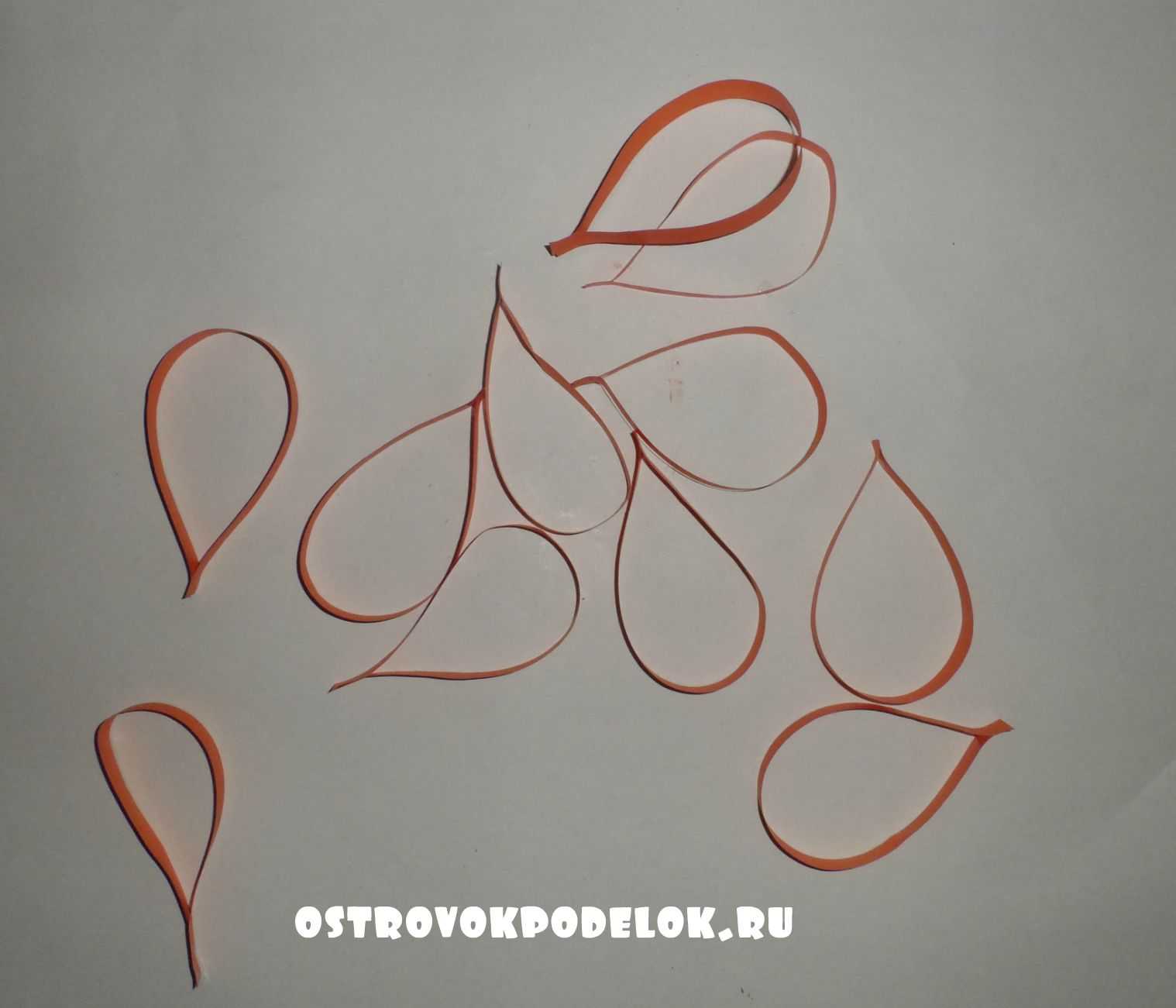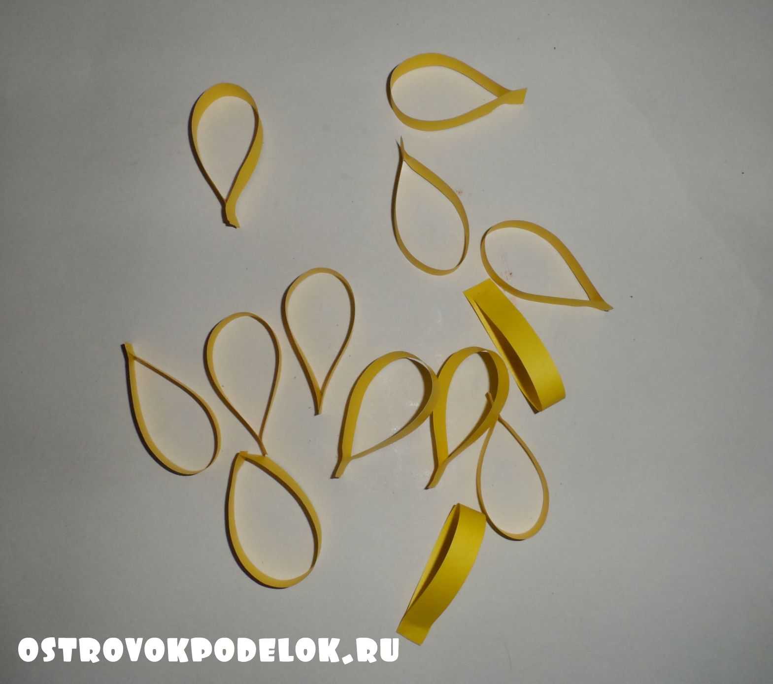 Нарезаем полосочки оранжевого цвета, но их длина больше, чем у полосок желтого цвета. Склеиваем кончики каждой полоски в форме капельки: