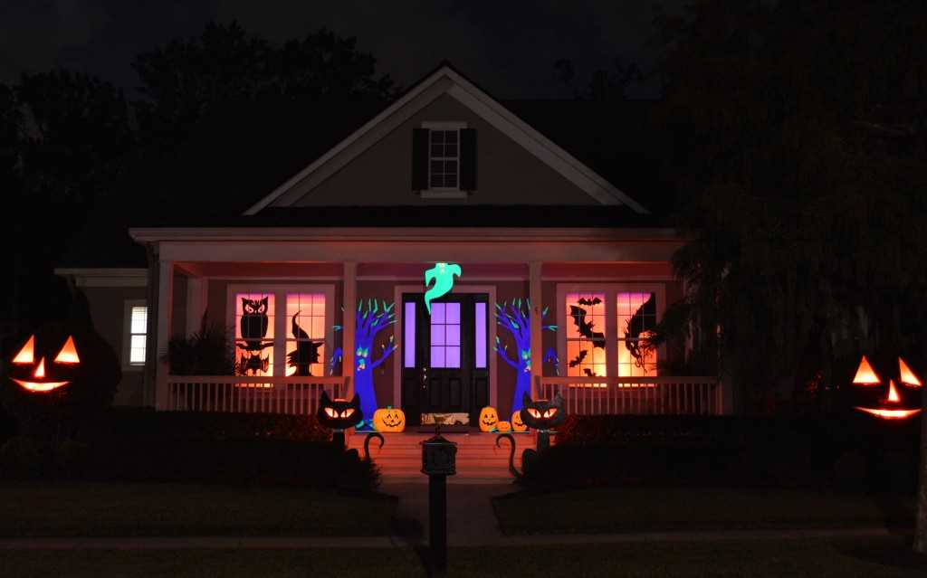 Можно создать видимость заколоченных окон – заклейте их изолентой черного цвета или широким цветным скотчем. Стекла, которые останутся чистыми, лучше украсить разными трафаретами в форме ведьм, тыкв, призраков – в магазинах огромный ассортимент подобного декора для праздника. Несложно сделать их своими руками – нарисовать и вырезать.
