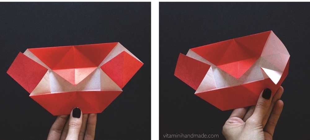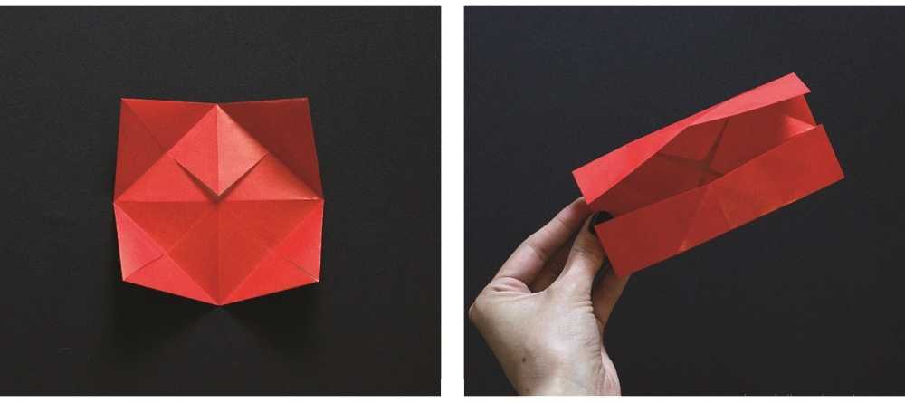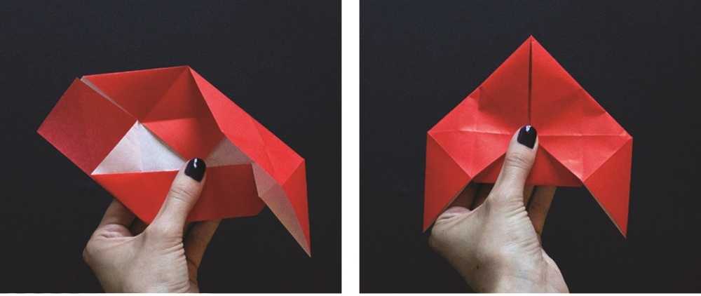 Сложите правую створку вверх, чтобы встретить верхний угол. Нижний клапан опустите вниз и придавите.