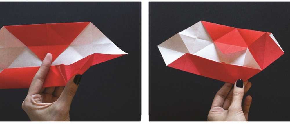 Откройте закрылки с правой стороны в центре и сложите сверху вниз к центру. Поднимите правый щиток, откройте его и опустите вниз в виде ромба. Повторите на другой стороне.