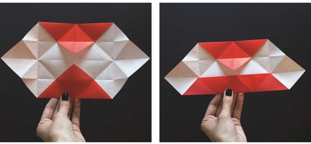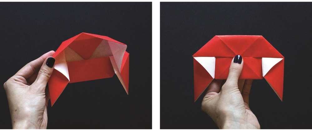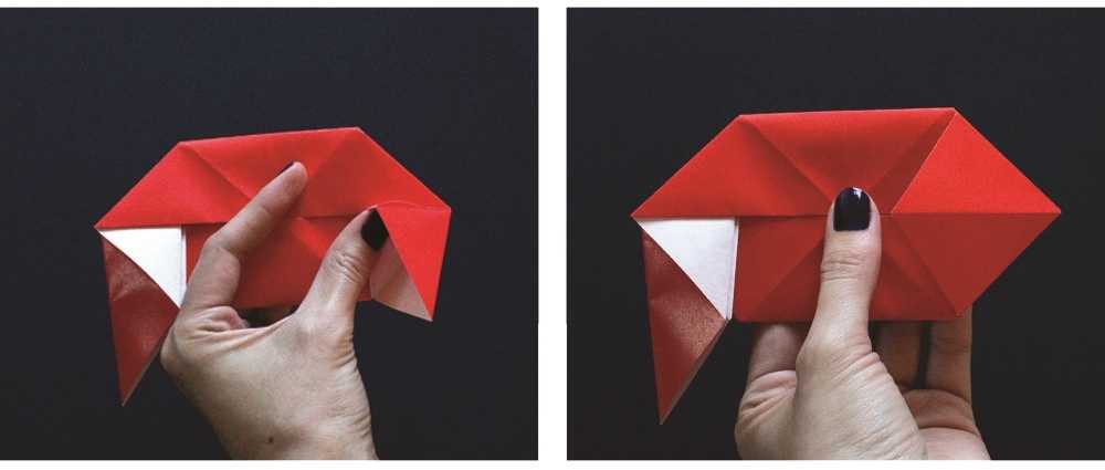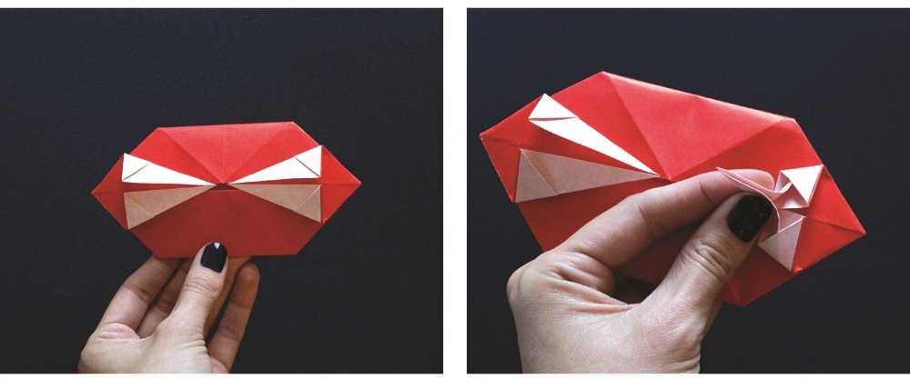 Вставьте пальцы во внутренние передние клапаны. Удерживая края, одновременно сложите их вниз, делая клыки.