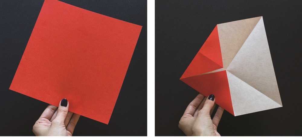 - Используем полученные линии в предыдущем шаге, для того, чтобы сложить углы внутрь фигуры. Для этого два близлежащих угла складываем вместе, как показано на фото. Таким же образом поступаем с противоположными углами. В итоге у нас должен получиться треугольник. Все места сгибов тщательно проглаживаем.