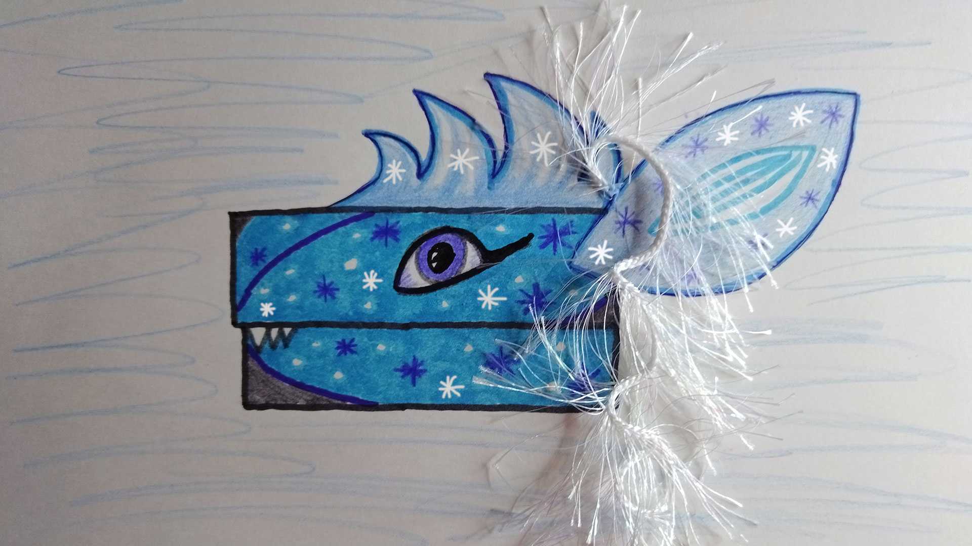 Мне очень нравится мой Новогодний дракон — девочка. Основной цвет — голубой. Еще можно было бы вместо снежинок или дополнительно к ним нарисовать спиральки — снежные завихрения, вместо белых пушистых ниток на фото приклеить разноцветную новогоднюю мишуру.