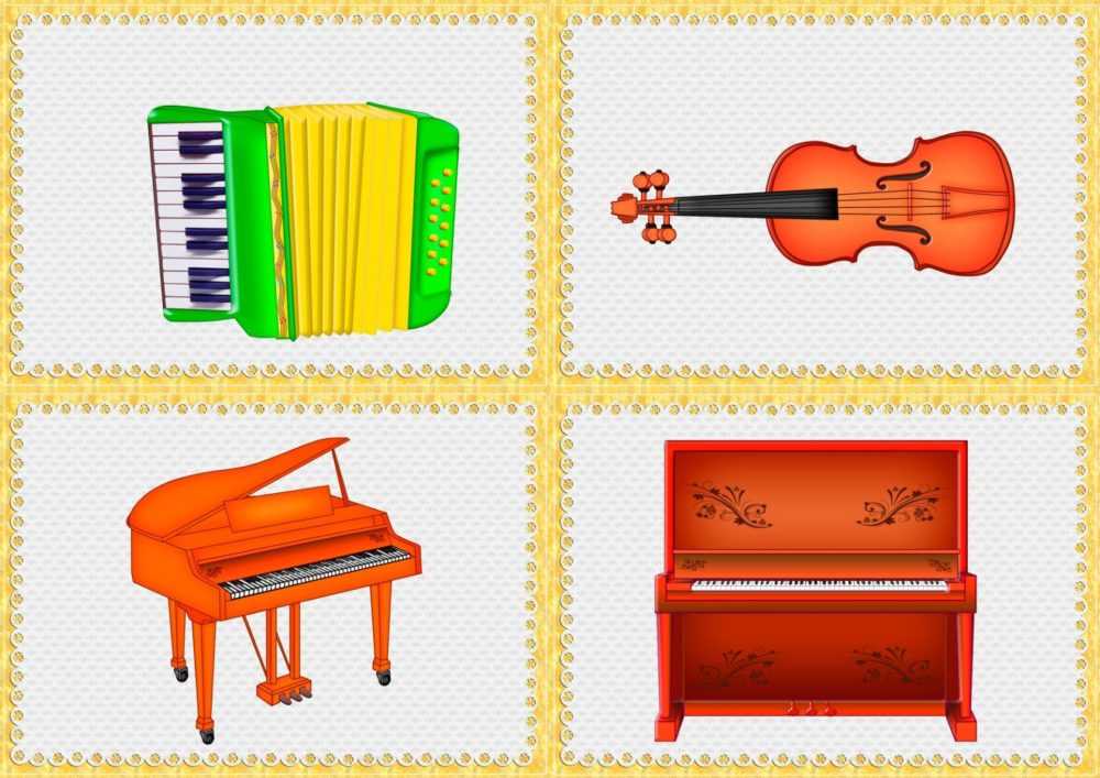 Игра развивает чувство ритма и музыкальный слух. Проводить ее положено в музыкальном кабинете. Нужно подготовить изображения разных музыкальных инструментов, вставить их в ячейки вагончиков.