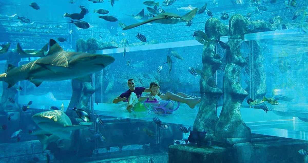 Большой популярностью в аквапарке «Aquaventure» Water Park пользуется «Атака акул»: прогулка на одиночном или спаренном надувном «пончике» через кишащую морскими хищниками лагуну.