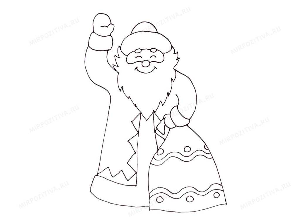 Чтобы борода выглядела пушистой, начертите зигзаги по ее краю. Сотрите лишние линии. Нарисуйте отвороты на шубе, рукавах, вложите мешок в левую руку. После этого начинающие художники могут на этом закончить карандашный рисунок и перейти к раскрашиванию.