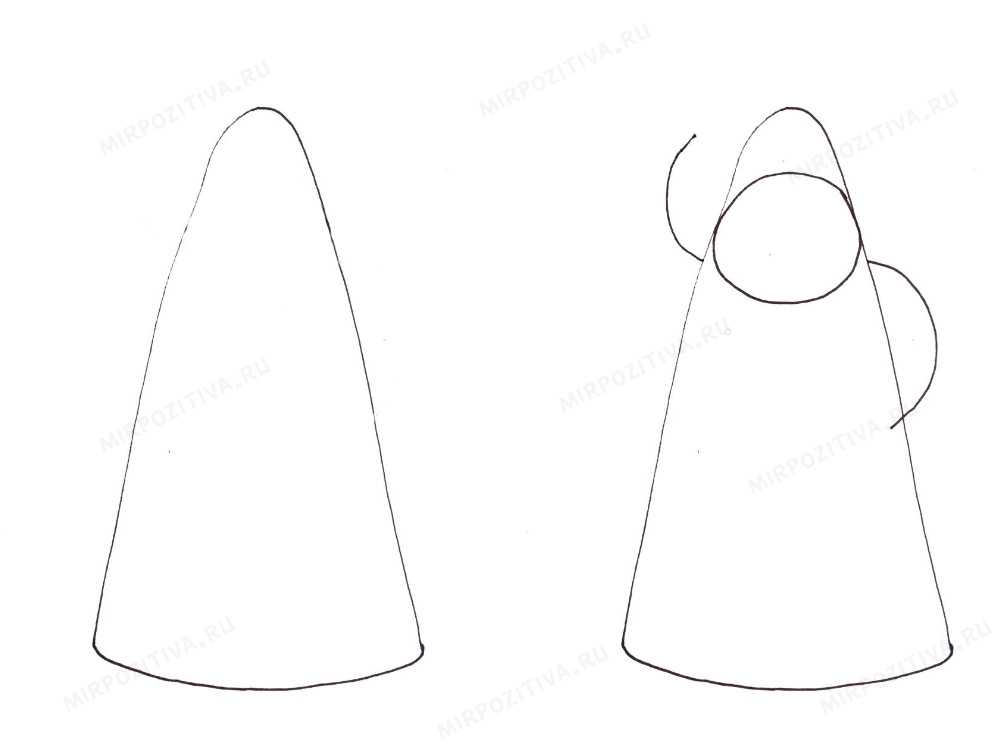 Наметьте остроконечную шапку, отворот, ниже отделите часть лица, незакрытую бородой. Бороду обозначьте двумя изгибами слева и справа от лица, соедините их внизу. Сотрите предварительные линии наброска. Нарисуйте меховую опушку передней части шубы, воротника и рукавов.