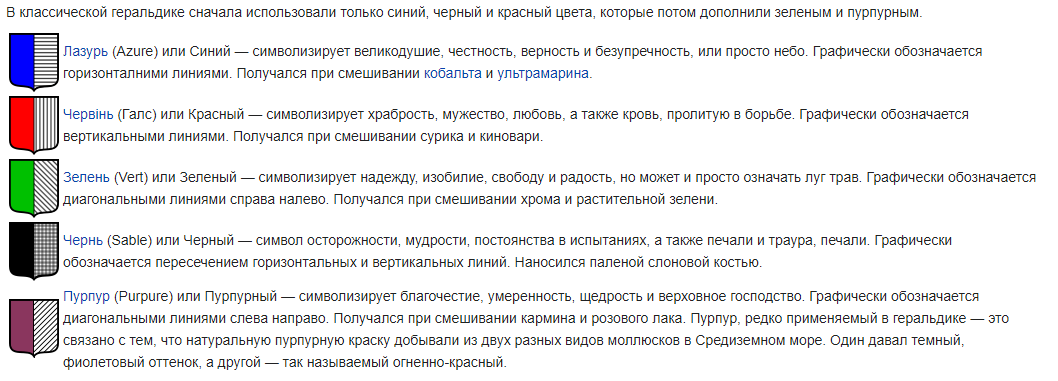 Цвета, используемые на щите, дают не только описание качеств человека, но и помогают описать его характер, а также отображают природные явления.