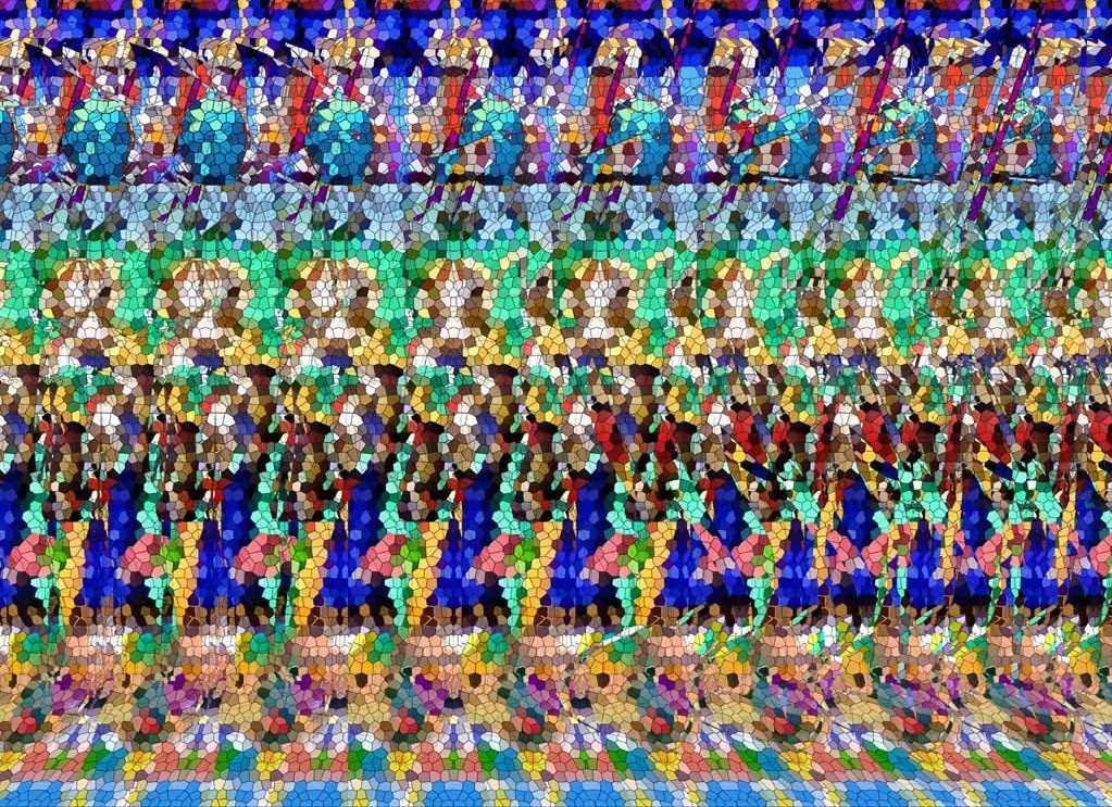 Иногда стереокартинки состоят не из геометрических фигур, а из других мелких изображений, которые человеческий мозг может скомпилировать в единое целое.