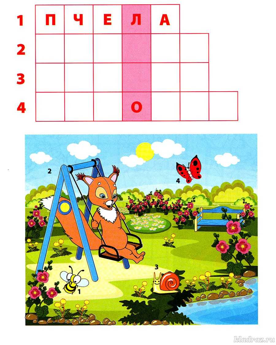 Посмотрите на картинку и разгадайте кроссворд. Если вы всё сделаете правильно, в розовом столбце появится название самого тёплого времени года!