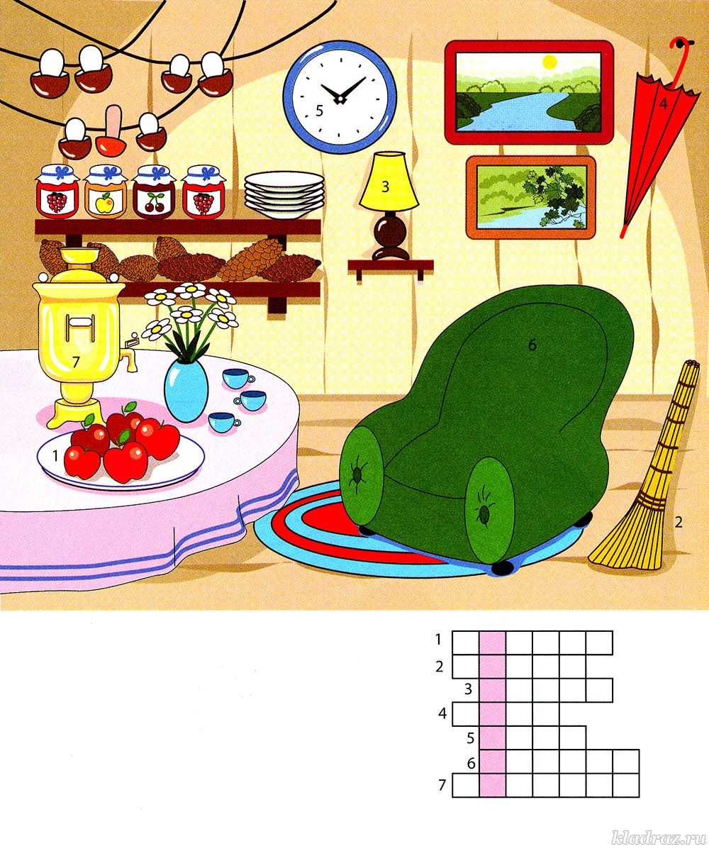 Ответы: яблоки, веник, лампа, зонт, часы, кресло, самовар.