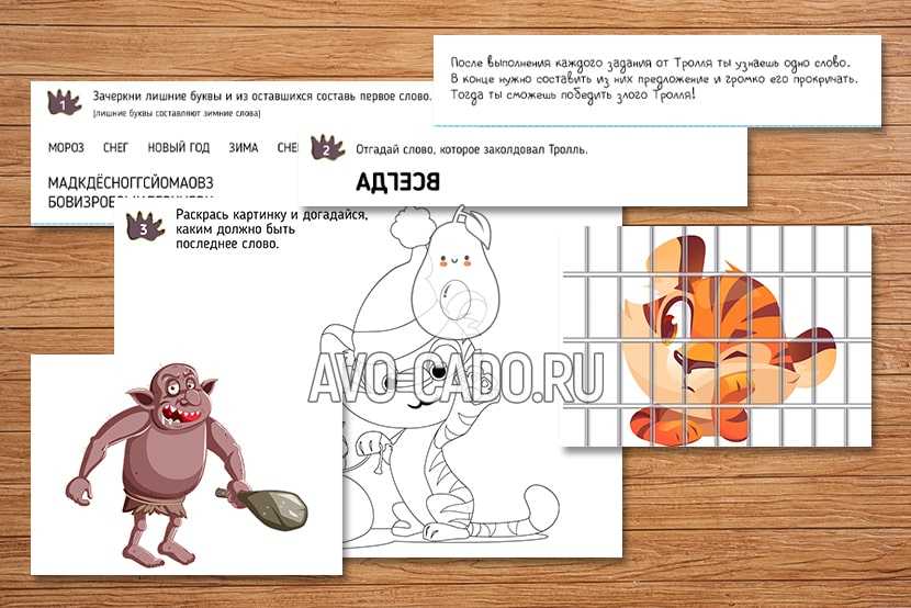 лист с описанием (начинается со слов «После выполнения каждого задания от Тролля»), картинка тигренка Энди в клетке, картинка злого Тролля с дубиной.