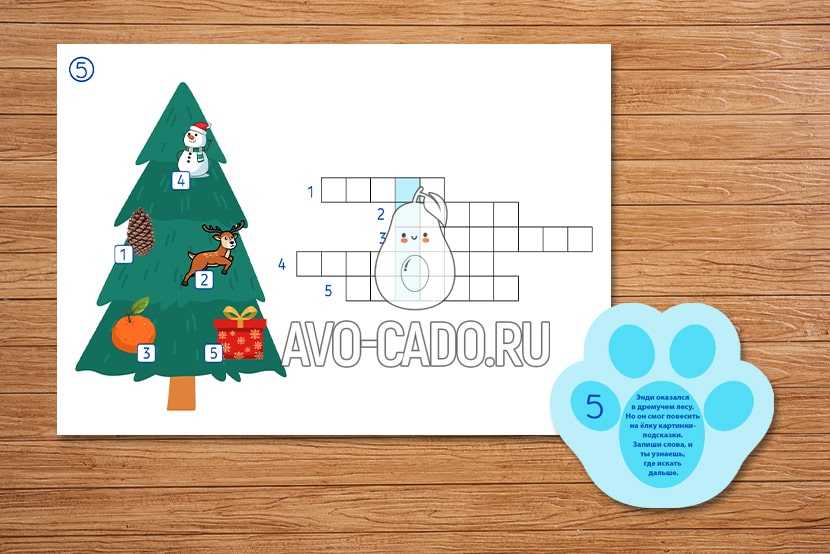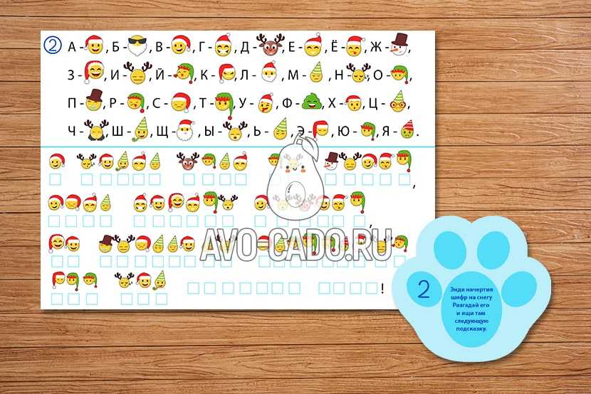 Задача ребенка найди все подсказки, разгадать их и спасти Новый Год. В этом же конверте лежит лапка с подсказкой,