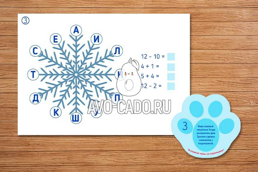 Снежинка с буквами на концах лучиков и примеры. Ребенок решает примеры и ищет нужную букву на снежинке.