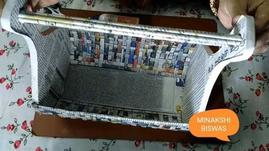 Обклеиваем внутренности корзинки бумагой и крепим ручку.