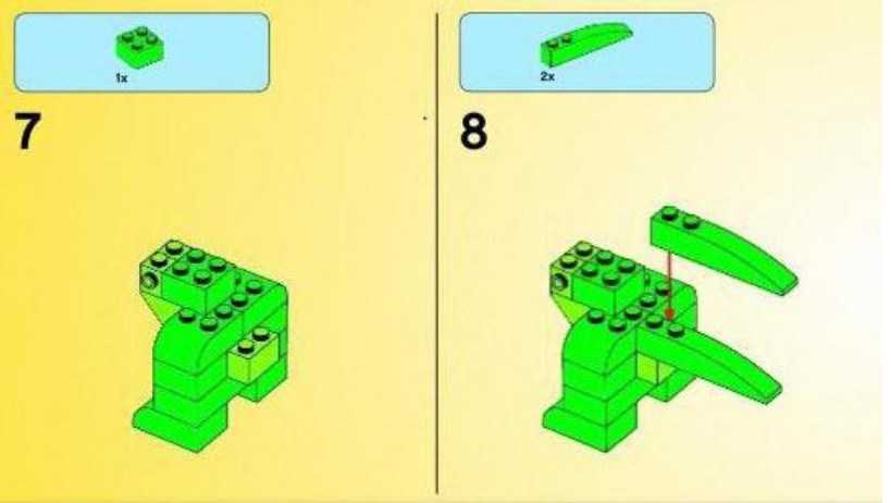 Затем возьмите 2 небольшие детали, имеющие втулки с боковых сторон другого оттенка, прикрепите спереди 2 треугольных детали. По бокам к втулкам прикрепите глаза динозавра.