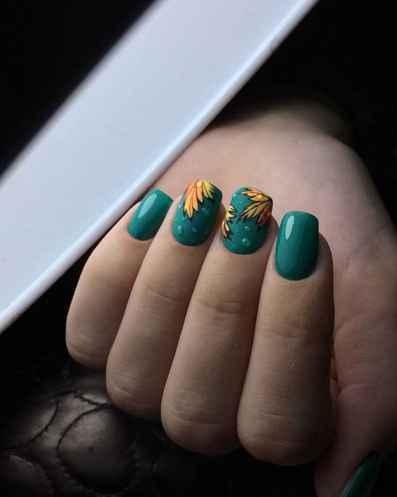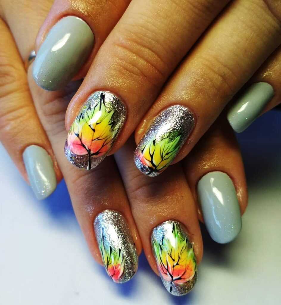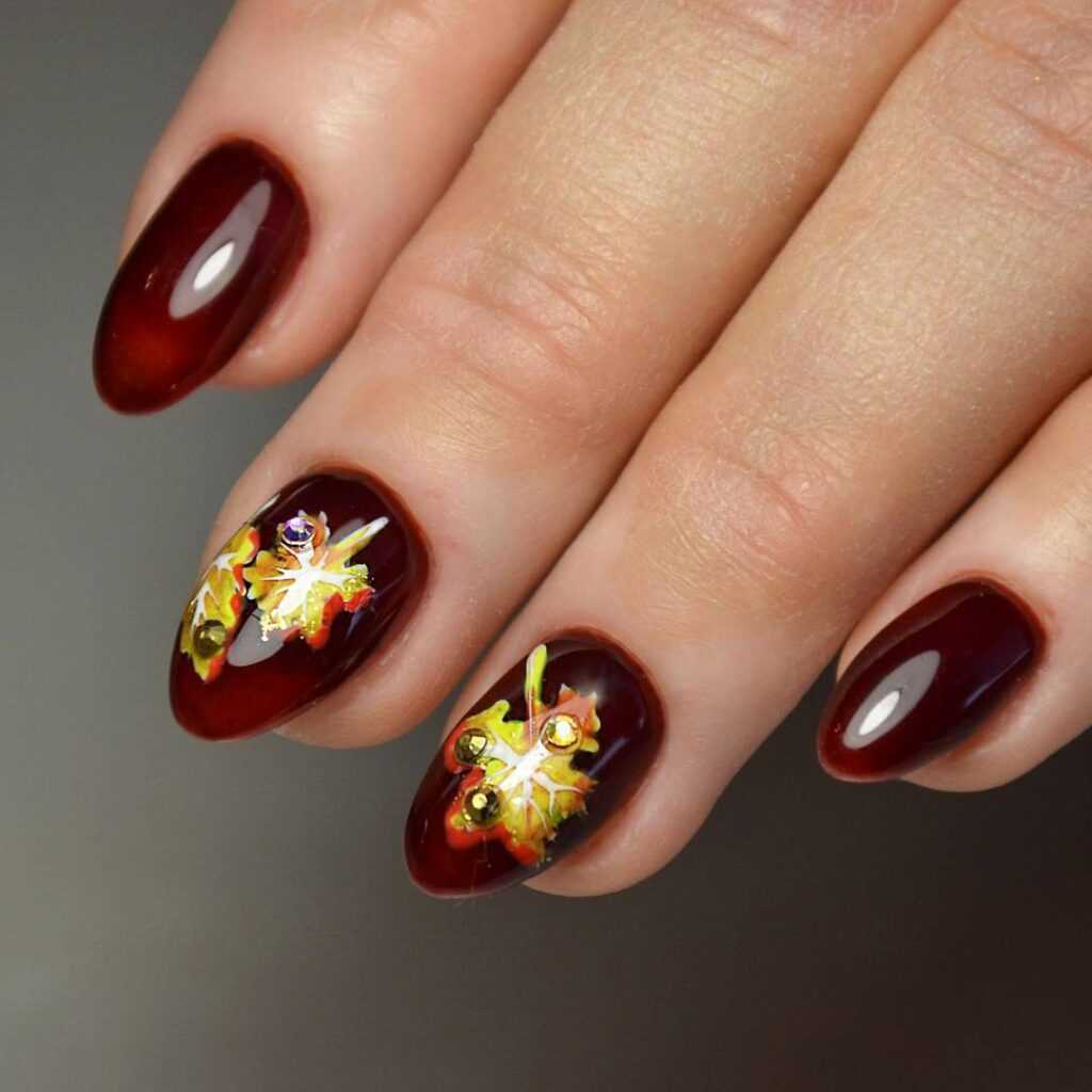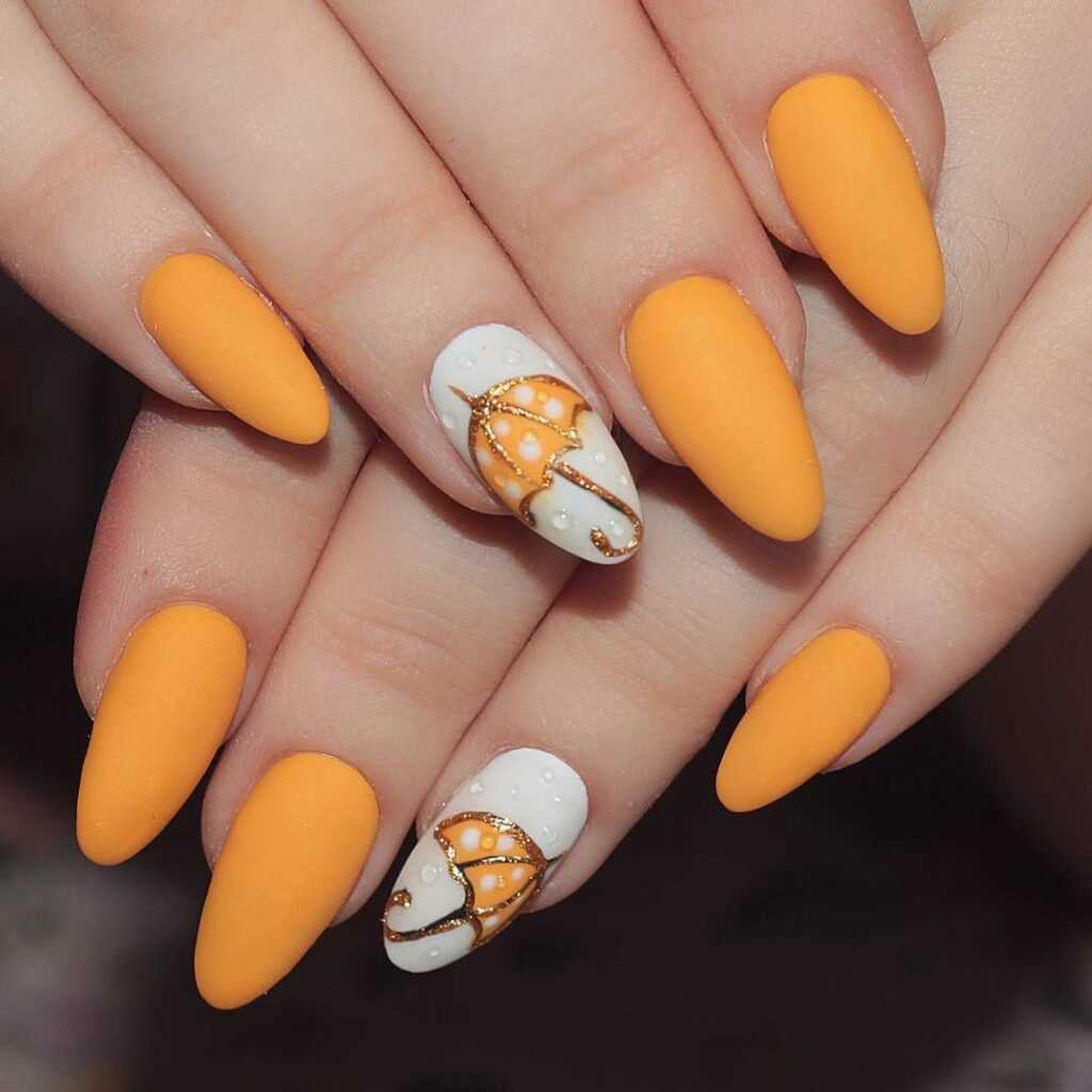 Осенняя пора ассоциируется с желтыми листьями, уютным пледом, чашечкой ароматного кофе и серыми тучами. Мастера успешно воплощают эти символы в своем искусстве. На Хеллоуин можно стилизовать маникюр под тыкву, мухоморы, летучих мышей , паучков, осенние листья. Посмотрите на фото, как красиво смотрятся на ногтях осенние мотивы.