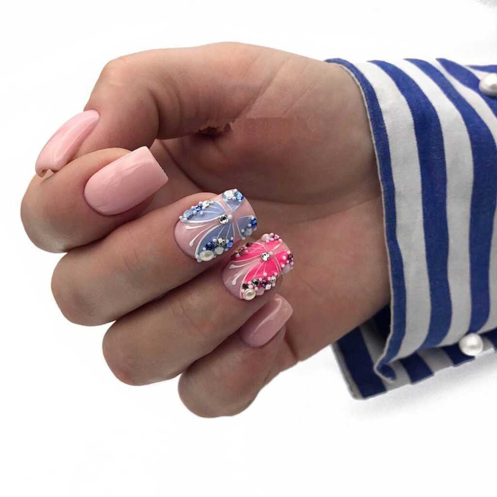Отличным решением будет французский маникюр, ведь классический дизайн актуален для всех возрастов. Скромный маникюр уходит в прошлое, уступая ярким и броским цветам. Нейл-арт может быть обыгран рисунками, но сделать это стоит только для одного из ногтей. Часто изображаться могут мотыльки, фрукты, стикеры, эмоджи и т.д.