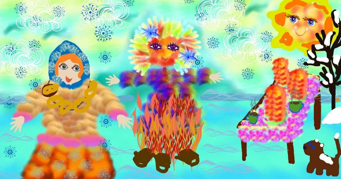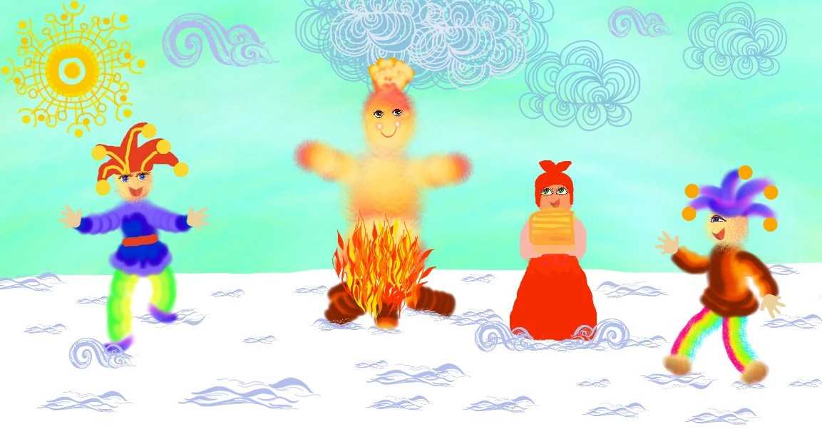 - Зимний пейзаж, в центре картины – чучело, рядом костер. На небе – яркое солнце.