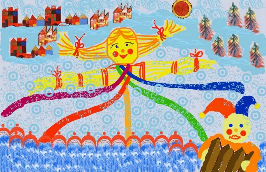 Рисунок получился весёлый. Интересно как создавался рисунок(по памяти или сама девочка придумывала сюжет)? Спасибо за приглашение на мастер-класс по рисованию цветными карандашами. Масленица начинается в понедельник, который называется «встреча». Но я бы тоже не прониклась ни разу — ну, масленица, ну, народный фольклор типа бабы яги и сапогов-скороходов. Как наряжаете дочек на празднование Масленицы?