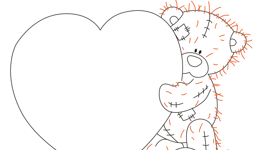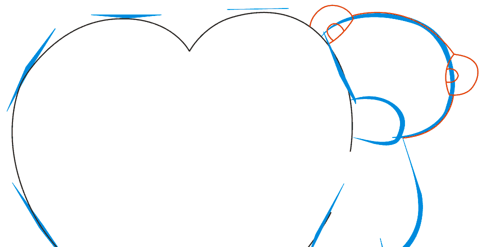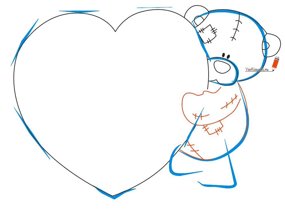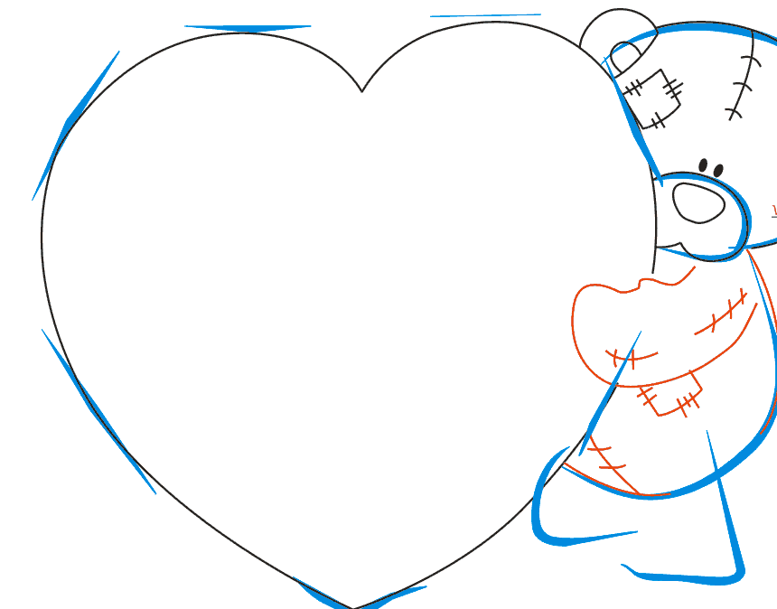 - Начинаем с простых набросков, благодаря которым мы сможем правильно построить композицию будущего рисунка Тедди с огромным сердцем. Проводим линии контура сердца. Оно занимает большую часть переднего плана на рисунке. На заднем плане проводим легкими линиями набросок тела и головы мишки. Помним о том, что давить на карандаш не нужно.