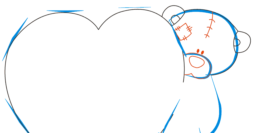 Слева дорисовываем заплатку. Вытираем вспомогательные линии. Дорисовываем недостающие детали: заплатку на животе с редкими стежками в виде черточек, швы на голове, щеках и голове мишки.