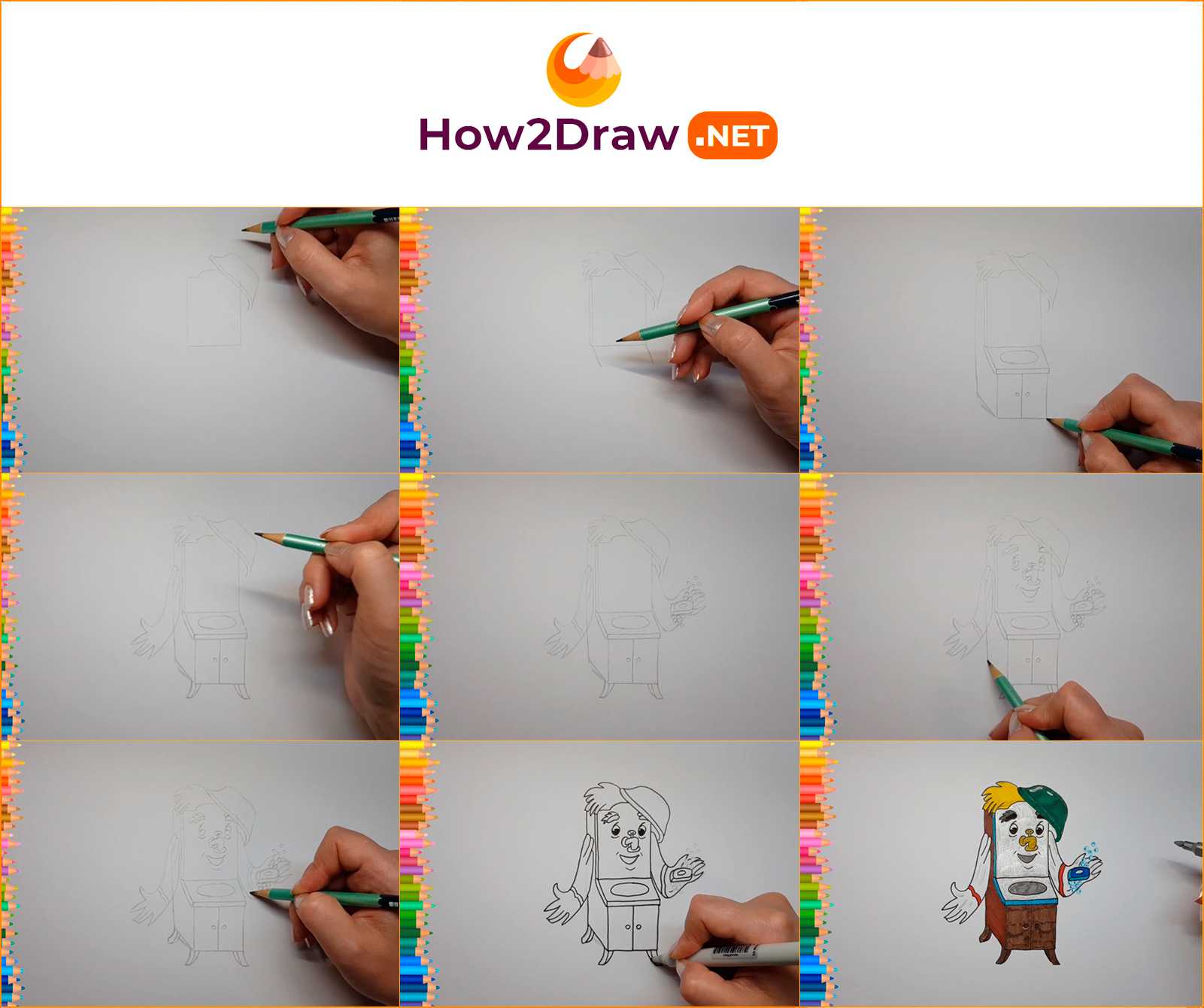 В следующих пунктах описано, как нарисовать Мойдодыра, чтобы он получился таким, как в мультфильме — добрым и уважаемым субъектом.
