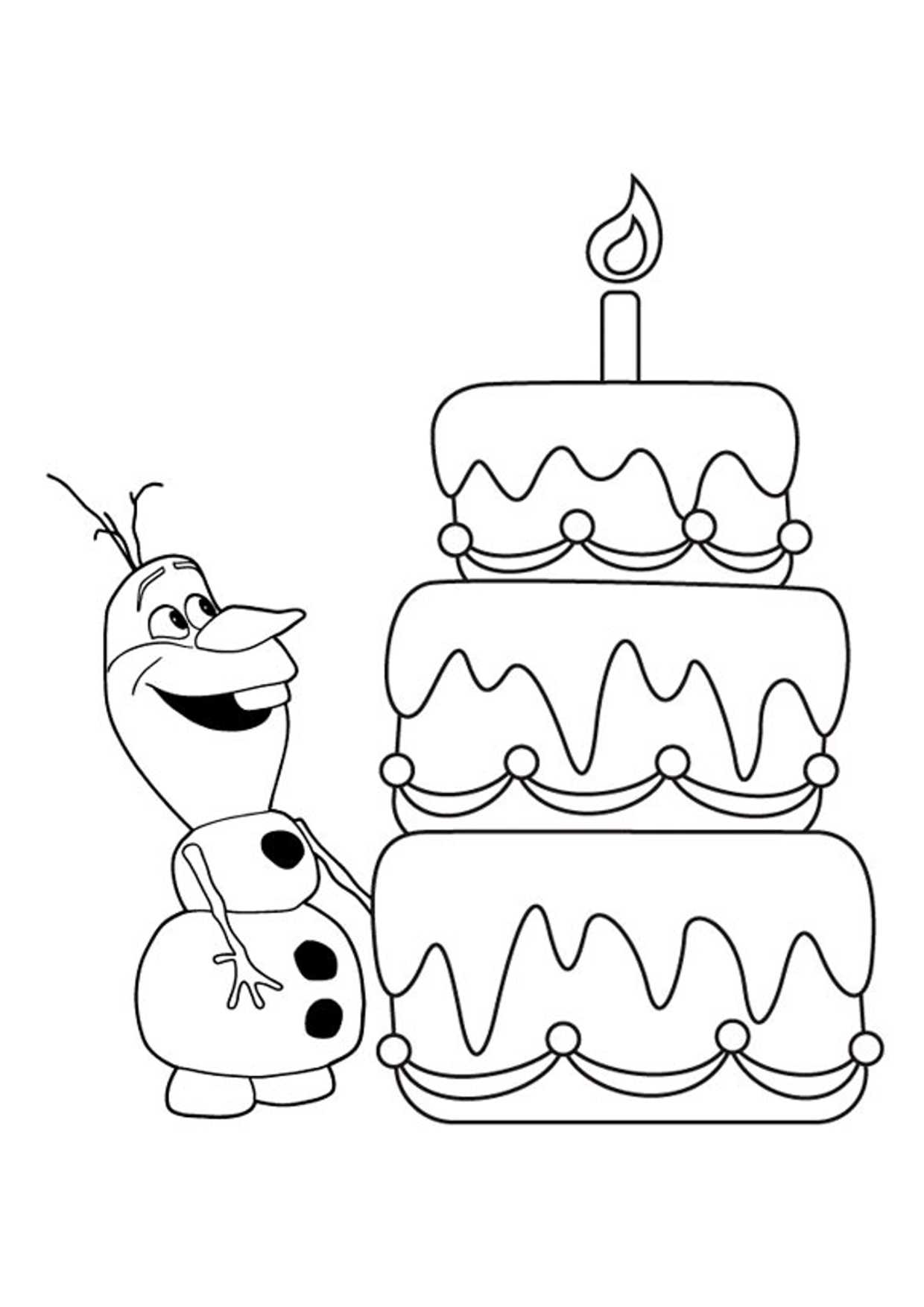 Отличная зимняя новогодняя раскраска, чтобы распечатать для детей 3-4 и 5-6 лет. С ней лучше работать фломастерами или гуашью. На большом торте для Олафа много крупных элементов словно бы просят перелива радужных цветов.
